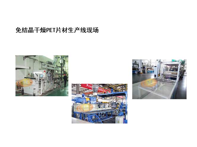 PET material hygroscopicity is strong, if the moisture content too high, hydrolysis will occur under high temperature processing, so drying treatment before processing in traditional technology is necessary. Facing this feature, CENMEN developed modified drying free directly forming technic: using self-developed exhaust extruder, vacuum exhaust system, sheet forming auxiliary machine or granulating auxiliary machine form a complete set of free pre-drying and dehumidification PET production line. At the same time, CENMEN drying free directly forming technic has gradually replacing the traditional drying treatment wildly in sheet forming, recycled pelletizing industries, the large amount of energy consumption and time consumption in the original dehumidification and drying process are eliminated.